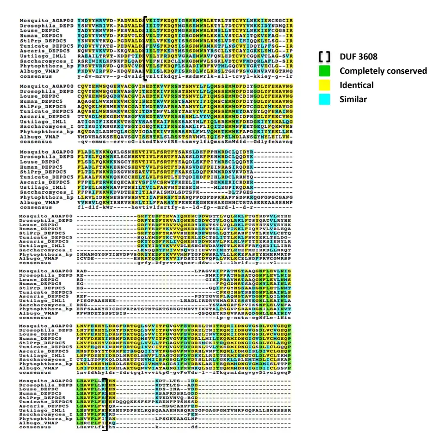 30 residues have been conserved since animals and fungi diverged, with 26 of these located in the DUF 3608 domain.[16] The following multiple sequence alignment illustrates this conservation of the DUF domain; representatives from invertebrate and fungal clades are aligned to the human DUF 3608 with completely conserved residues colored green.