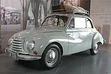 The DKW 3=6 is a compact front-wheel drive saloon manufactured by Auto Union GmbH.[2] The car was launched at the Frankfurt Motor Show in March 1953 and sold until 1959. It carried the name Sonderklasse ("Special Class") on the right hand fender of all steel bodied models - this being part of the model name for this range. The first model in the range was named by factory project number, DKW F91, which was replaced by the F93 and F94 models from the 1956 model year[2]. The F93 and F94 models were referred to by Auto Union as the "Big DKW 3=6" (Großer 3=6).[2] From 1958, by which year the car's successor, the Auto Union 1000 Coupe de Luxe, was already being sold and the earlier version had therefore become, in essence, a ‘run-out’ model, it was known more simply (in the USA and the Netherlands only) as the DKW 900.[3]