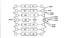 It folds into a single domain of mixed α/β structure, with seven α helices and eight β strands. The core of the protein consists of a curved, antiparallel β sheet with a protruding β hairpin (β3β4) that inserts into the minor groove of the bound DNA. A series of α helices and connecting loops form the remainder of the DNA binding interface.[14] It lacks the helix-hairpin-helix motif associated with other base excision-repair proteins and, in fact, it does not resemble any other model in the Protein Data Bank.[14]