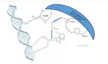 In cells,[10] AAG is the enzyme responsible for recognition and initiation of the repair, via catalysing the hydrolysis of the N-glycosidic bond to release the alkylation-damaged purine bases.[11] Specifically, hAAG is able to efficiently identify and excise 3-methyladenine, 7-methyladenine, 7-methylguanine, 1N-ethenoadenine and hypoxanthine.[12]