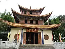 Daguan Park (simplified Chinese: 大观公园; traditional Chinese: 大觀公園; pinyin: Dàguān Gōngyuán) is a lakeside park located in the southwestern suburb of Kunming, Yunnan, China. Today many locals come to sit, drink tea, fly kites, and go boating. Among shady walks and pools, Daguan's focal point is Daguan Lou, a square, three-storeyed pavilion built to better the Kangxi Emperor's enjoyment of the distant Western Hills and now a storehouse of calligraphy extolling the area's charms. The most famous poem here is a 118-character verse, carved into the gateposts by the Qing dynasty scholar Sun Ran, reputed to be the longest set of rhyming couplets in China. The park is set on Daguan Stream, which flows south into Lake Dian, and there are frequent hour-long cruises down the waterway, lined with willows, to points along Lake Dian's northern shore. Lake Dian, also known as the Kunming Lake, is the largest lake on the Yunnan-Guizhou Plateau. At Longmen of the Western Hills, there is a panoramic view of the lake.