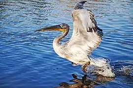 The somewhat similar-looking great white pelican broadly overlaps in size but has greater size sexual dimorphism: female great whites can be noticeably smaller than female Dalmatians but male individuals of the two species are essentially the same size and weight.[8][14] However, the Dalmatian differs from this other very large species in that it has curly nape feathers, grey legs and silvery-white (rather than pure white) plumage. In winter, adult Dalmatian pelicans go from silvery-grey to a dingier brownish-grey cream colour.[16] Immature birds are grey and lack the pink facial patch of immature white pelicans. The loose feathers around the forehead of the Dalmatian pelican can form a W-like-shape on the face right above the bill.[14] In the breeding season it has an orange-red lower mandible and pouch against a yellow upper mandible. In winter, the whole bill is a somewhat dull yellow. The bill, at 36 to 45 cm (14 to 18 in) long, is the second largest of any bird, after the Australian pelican (Pelecanus conspicillatus).[14] The bare skin around the eye can vary from yellow to purplish in colour.[17] Among standard measurements, compared to the great white pelican, the Dalmatian's tarsus is slightly shorter, at 11.6 to 12.2 cm (4.6 to 4.8 in), but its tail and wing chord length are notably larger, at 22 to 24 cm (8.7 to 9.4 in) long and 68 to 80 cm (27 to 31 in), respectively.[18][19] When the Dalmatian pelican is in flight, unlike other pelicans, its wings are solid grayish-white with black tips.[14] It is an elegant soaring bird. When a whole flock of Dalmatian pelicans is in flight, all its members move in graceful synchrony, their necks held back like a heron's.