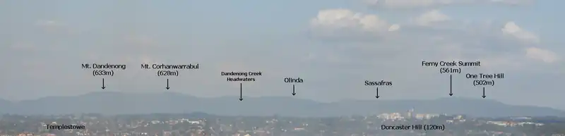![]() Left - Mount Dandenong and right - Mount Corhanwarrabul, viewed from Mooroolbark | |