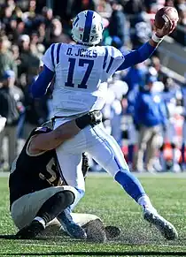 In 2017, he completed 230 of 413 passes (55.7%) for 2,439 yards, 14 touchdowns and 11 interceptions as a junior.[11] Jones was named MVP of the 2017 Quick Lane Bowl against Northern Illinois where he went 27-of-40 with 252 passing yards and two touchdowns, along with 86 rushing yards from sixteen carries for one touchdown.[12]