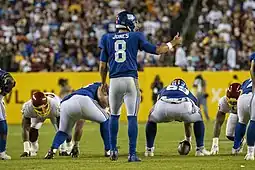 Despite a stellar preseason, Jones was named the backup behind Eli Manning.[19] Jones played his first regular season game on September 8, 2019, against the Dallas Cowboys in relief of Manning, where he completed 3-of-4 passes for 17 yards and lost a fumble as the Giants lost 35–17.[20] On September 17, 2019, Jones was named the starter over Manning for the Week 3 matchup against the Tampa Bay Buccaneers.[21] In his first start, Jones completed 23 out of 36 passes for 336 yards with a 112.7 passer rating and two passing touchdowns along with 28 rushing yards and two rushing touchdowns in a 32–31 comeback win against the Buccaneers despite losing two fumbles.[22] He became the first Giants' rookie quarterback to win his first career start since Scott Brunner in 1980. Jones led the Giants back from an 18-point deficit to beat the Buccaneers and became the seventh rookie quarterback in NFL history since 2010 to have a game-winning drive in their first career start.[23][24] He was also named NFC Offensive Player of the Week for his performance in Week 3.[25]