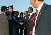 In 1955 Moi entered politics when he was elected Member of the Legislative Council for Rift Valley. He was the chosen replacement of Dr. John ole Tameno, the former representative who had had to quit due to heavy drinking and suspected connections to the freedom movement.[12] In 1957 Moi was re-elected Member of the Legislative Council for Rift Valley. Moi was part of the Kenyan delegation at the Lancaster House Conferences in London, which drafted the country's first post-independence constitution, and in 1961 became Minister of Education in the pre-independence government.[13]