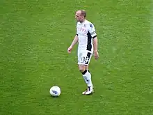 Murphy cemented himself as a regular starter, kept his place in the team throughout the season and scored six goals in 43 matches. One goal, a rare header scored on 11 May 2008, gave Fulham a 1–0 win away at Portsmouth and ensured their Premier League survival at the expense of Birmingham City and Reading;[23] the goal was scored as manager Roy Hodgson prepared to substitute Murphy. Following the match, Murphy highlighted Hodgson's "key role" in the team's avoiding relegation.[24] Murphy signed a new one-year contract, with an option for a further year, at the end of the season,[25] and was appointed club captain for 2008–09.[26]