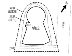 The largest zenpō-kōen-fun (前方後円墳) in the Tōkai region of Japan, the Dampusan Kofun is shaped like a keyhole, having one square end and one circular end, when viewed from above. The tumulus has a total length of 151 meters, with the posterior circular portion containing the burial chamber having a diameter of 80 meters and a height of 13 meters. The anterior rectangular portion has a width of 116 meters and height of 16.2 meters. The posterior circular portion is actually thought to have been originally trapezoidal, and built in three tiers like a stepped pyramid, with lines of cylindrical haniwa on each tier. The presence of a large number of rounded river boulders indicates that the surface may have originally been paved with stones (fukiishi). In addition, a square platform was built between the front and rear portions, which was possibly a stage for use in ceremonies. Numerous fragments of cylindrical haniwa and Sue ware pottery have been recovered from this area. The tomb was originally surrounded by at least one moat which can clearly been seen in Meiji period maps, but the urban encroachment of the surrounding area in the post-World War II era has obliterated most traces. [3]