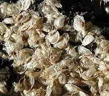 Daphnia magna is a typical water flea of the genus Daphnia. The females reach up to 5 mm in size, the males about 2 mm, thus they are among the largest species in the genus.[2] The body is protected by a translucent carapace made of chitin, a transparent polysaccharide.[3] It has a ventral opening and five pairs of thoracic limbs, used to help the filtering process.[4] Spike rows run along the back of the carapace. The intestine is hook-shaped and has two digestive ceca. The head has two antennae and a large compound eye.[5][6]