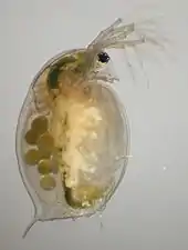 | Female Daphnia magna with a clutch of asexual eggs: The animal is about 4 mm long. | |