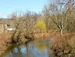 The valley of Darby Creek is considerably narrower in its upper reaches, but widens out as it approaches the Delaware River. Numerous reaches of the creek have been armored with boulders or riprap.[5] Upstream of the tributary Cobbs Creek, the stream's channel is sinuous and the creek flows through a narrow valley bordered by low, steep hills. From Cobbs Creek downstream to its mouth, the creek is in a tidal flat.[8]