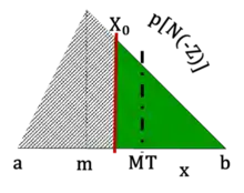 The possibility function for the fuzzy pay-off is . A simple interpretation is the proportionality ratio of the positive area of the fuzzy NPV over the total area of the fuzzy NPV. The probability of the project payoff for the DM Range Option is proportional to the area (CDF) of the positive distribution relative to the complete distribution. This is computed as In each the ratios of the areas compute to the same possibility/probability value. The positive payoff of fuzzy pay-off simply is the mean of the positive area of the fuzzy NPV, or . Likewise, the positive payoff for the DM Range Option is the mean of the right tail (MT), or less the strike price This insight to the mechanics of the two methods illustrates not only their similarity but also their equivalency.