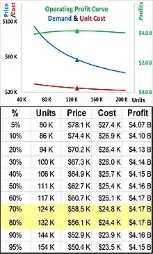 Fig. 11 A single instance example (simulation draw) of the three components that form the operating profits graph. The triangular markers indicate a maximum value for operating profit, delineating optimal price, units, and cost values. Yellow rows indicate optimal ranges.