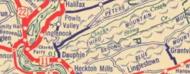 Dauphin is located on the western edge of Dauphin County at 40°22′00″N 76°55′52″W,[4] on the east bank of the Susquehanna River. The land at the river's edge is alluvial floodplain, but Dauphin sits at the head of a narrow valley between two mountains, at the mouth of Stony Creek. The valley between the two mountains is called Stony Valley, which contains the villages of Singersville and Ellendale Forge. This section along the Susquehanna River is a gateway from the southeastern plains into the Appalachian Mountains and the north-central part of the state. Berrier Island is also located at Dauphin.[5]