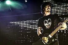 Also in 2003, Grohl stepped behind the kit to perform on Killing Joke's second self-titled album.[76] The move surprised some Nirvana fans, given that Nirvana had been accused of plagiarizing the opening riff of "Come as You Are" from Killing Joke's 1984 song "Eighties".[77] However, the controversy failed to create a lasting rift between the bands. Foo Fighters covered Killing Joke's "Requiem" during the late 1990s, and were even joined by Killing Joke singer Jaz Coleman for a performance of the song at a show in New Zealand in 2003.[78] Also in 2003, at the 45th Annual Grammy Awards, Grohl performed in an ad hoc supergroup with Bruce Springsteen, Elvis Costello, and Steven Van Zandt for a performance in tribute of then-recently deceased singer/guitarist Joe Strummer.[79]