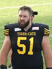 In 2019, he was the unanimous selection for the Edmonton Eskimos' Most Outstanding Offensive Lineman.[7] He re-signed with Edmonton on a contract extension through 2023 on December 26, 2020.[8] He played in 94 games for Edmonton over seven seasons.