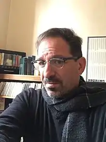 ![]() Biespiel speaking at the New School in New York, March 2016 | |