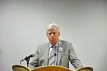 Miller's plans to run for mayor were well-known around city hall in 2002, and there was little surprise when he formally declared his candidacy in January 2003.[32] His earliest supporters included councillors Howard Moscoe, Sandra Bussin, Irene Jones and Anne Johnston and urban planner Jane Jacobs.[33] He was later endorsed by councillors Olivia Chow, Joe Pantalone and Brian Ashton, public figures such as June Callwood, Judy Rebick, Margaret Atwood, Michael Ondaatje and Michele Landsberg, American environmental activist Robert F. Kennedy Jr., the Canadian Union of Public Employees and the Toronto Professional Fire Fighters Association.[34] The Toronto Star newspaper, journalist Royson James and councillors Raymond Cho and Michael Walker also endorsed Miller near the end of the campaign.[35]