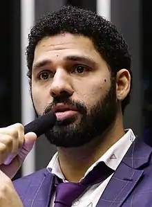 In 2018, Miranda was elected as a substitute for PSOL deputy Jean Wyllys. When Wyllys, an LGBT member, announced in January 2019 that he had left the country due to death threats, Miranda, who was also a PSOL member, took Wyllys' place in the Chamber of Deputies. After taking his seat, Miranda began to receive "hundreds" of death threats.[3][16] Joice Hasselmann, a representative of the ex-President Jair Bolsonaro's party, accused Miranda of buying his seat. Due to the intimidation from Hasselmann and Bolsonaro supporters during the Vaza Jato reporting Greenwald was engaged in, Miranda disclosed that he had begun taking anti-depressants and that he and Greenwald rarely left their home, and when so only with hired bodyguards.[17]