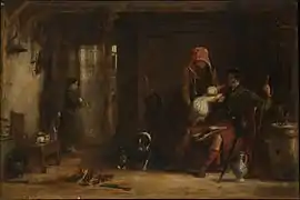 Sir David Wilkie RA (18 November 1785 – 1 June 1841) was a Scottish[1] painter, especially known for his genre scenes. He painted successfully in a wide variety of genres, including historical scenes, portraits, including formal royal ones, and scenes from his travels to Europe and the Middle East. His main base was in London, but he died and was buried at sea, off Gibraltar, returning from his first trip to the Middle East. He was sometimes known as the "people's painter".