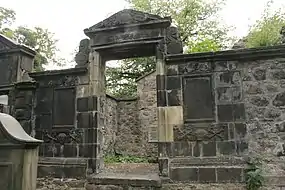 At his death, Williamson was buried within an enclosure on the Knowe, the area of high ground south west of the church. As had been his wish, this site of his grave was near that of his predecessor Robert Pont. His family erected no memorial inside the vault, which was then normal with enclosed vaults. Around the turn of the 20th century, a memorial plaque was installed by an anonymous descendant, whom William Pitcairn Anderson speculates to be Williamson's successor Andrew Wallace Williamson.[14][15]