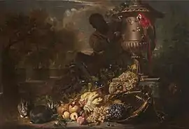 His fruit still lifes of fruits and flowers painted on large canvases are complex Baroque compositions, which often include animals in an outdoor setting. Large, Italianate fruit still lifes in the Musée des Beaux-Arts de Nantes can likely also be attributed to de Coninck. An example of his fruit still lifes is the Still life of fruit and flowers with animals (Musée Fesch), which shows a still life with fruits and flowers near an outdoor fountain and a landscape in the distance. A monkey, two rabbits and a parrot enliven the painting.[2]