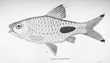 Dawkinsia filamentosa,[3] the filament barb, or poovali paral is a species of barb. Young fish have barely any color and black spots. They start having more color at three months old. The fish is a swift swimmer.[4] Males are larger than females and they fertilize eggs by swimming into the cloud of eggs.[5] The species is most commonly found in coastal floodplains near the Southwest Indian states of Kerala, Tamil Nadu and Karnataka. This species is also known as blackspot barb.[6]