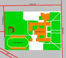 DeVilbiss opened its doors in 1931 to serve Toledo's growing west side and was built to accommodate 2,400 students.[1] The DeVilbiss Tigers were members of the Toledo City League and donned the colors of orange and black for sporting events. On the contrary, the school colors were the colors of the rainbow, hence the yearbook being the Pot O' Gold, and the school newspaper/newsletter the Prism. Their main rivals were the Start Spartans, although rivalries existed with the St. Francis Knights and the Libbey Cowboys, whom they annually played football against on Thanksgiving day[2] from 1933–1963.