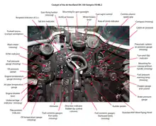In comparison to later aircraft, the Vampire had a relatively disorganised cockpit that in some aspects lacked ergonomic measures; such as the fuel gauges being difficult for the pilot to observe without pulling the control column back.[31] A few controls, such as the low-pressure fuel cock, were known for being difficult to move or were otherwise obstructed by other controls. The pilot was provided with a fairly favourable external view, in part aided by the relatively small size of the Vampire.[31]