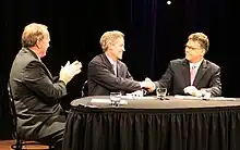 Despite entering the race late, Barkley was polling as high as 19% by October 1.[11] The campaign also produced two statewide radio ads featuring Barkley and Ventura.[12] Barkley, unlike many third-party and independent candidates, was included in public debates with the major party nominees; the first of five three-way debates took place October 5.[13] He received the endorsement of former U.S. Representative Tim Penny.[14] Numerous polls showed that Barkley would affect the outcome of the race.[15] Barkley raised $163,358 for his campaign (less than 1% of each of his opponents' totals).[16] He received over 435,000 votes, about 15% of the total, significantly affecting a race in which Franken defeated Coleman by only 312 votes.[17][18]