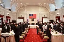 Around 1000 guests attended the 2.5-hour service, among whom were Lee's family members, the members of the funeral committee and foreign guests, including Keith J. Krach, US Under Secretary of State and Yoshiro Mori, former prime minister of Japan.[27] Hiroyasu Izumi, chief representative of Japan–Taiwan Exchange Association Taipei Office, read an eulogy on behalf of Shinzo Abe, the now former Japanese prime minister, who expressed respect to Lee for instilling universal values in Taiwan and forging the friendship between the two countries.[25][28] In a pre-recorded video, the 14th Dalai Lama shared his memories with Lee and praised him for his commitment to democracy and freedom and preservation of Chinese culture in Taiwan.[25][28]