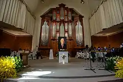 At 9 am on 19 September, the farewell service (memorial service) was held at the Main Chapel in Aletheia University, which was situated in Tamsui in New Taipei City; members of public could register to attend at the chapel and concert hall of the neighbouring Tamkang Senior High School.[25][26] The title of the ceremony was "I do it with the People in my heart", taken from his speech during his visit to Cornell University in 1995. The ceremony was broadcast live.