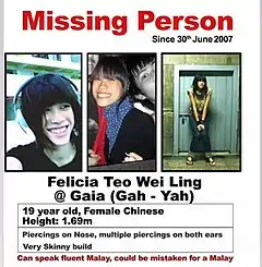 Felicia Teo Wei Ling (23 February 1988 – 30 June 2007; 张玮凌 Zhāng Weǐlíng), was a Singaporean who was presumed dead after she went missing on 30 June 2007. She was alleged to be murdered by her two friends whom she visited on the same night. Teo was reported missing four days after she disappeared, and there were both search efforts and investigations made to trace her whereabouts. The case made headlines due to extensive public appeals and searches for Teo's whereabouts and became one of Singapore's high-profile missing person cases.[1]