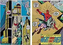 The Green Goblin abducts Peter's girlfriend, Gwen Stacy, and lures Spider-Man to a tower of either the Brooklyn Bridge (as depicted in the art) or the George Washington Bridge (as given in the text).[1][2] The Goblin and Spider-Man clash, and the Goblin hurls Gwen off the bridge. Spider-Man shoots a web strand at her legs and catches her. As he pulls her up, he thinks he has saved her, however he quickly realizes she is dead. Unsure whether her neck was broken by the whiplash from her sudden stop or had been already broken by the Goblin prior to her fall, he blames himself for her death. A note on the letters page of The Amazing Spider-Man #125 states: "It saddens us to say that the whiplash effect she underwent when Spidey's webbing stopped her so suddenly was, in fact, what killed her.", although later issues would reveal Gwen died from the fall itself.[1]