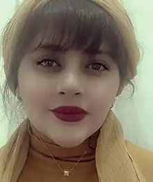 Mahsa Amini was born on 21 September 1999[34][35] to a Kurdish family in Saqqez, Kurdistan Province, in northwestern Iran.[36] While Mahsa was her official Persian given name, her Kurdish name was Jina, and this was the name her family used.[37][38] Her father is an employee in a government organization and her mother is a housewife.[39] She attended Taleghani Girls' High School in Saqqez, graduating in 2018. At the time of her death, Amini had just been admitted to university, aiming to become a lawyer.[40][41]