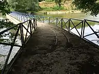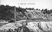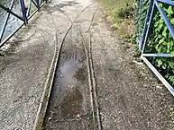 The Decauville railway with a gauge of 600 mm (1 ft 11+5⁄8 in) ran from the quarries to the forges and offices at the railway station, near which other metalworking factories and electric motor works were opened up via the narrow-gauge railway around 1932.[6][7] The Decauville railway was operated with steam locomotives and numerous tipping lorries. Remains of the tracks are still preserved on the embankment that divides the lake into two parts. In the newly created park on Rue de la Gare, the park paths follow the route of the former light railway.[8]
