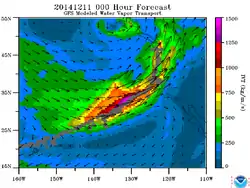 ![]() Satellite image of the system off the coast of California, on December 10, 2014, with the flow of the Pineapple Express marked by the yellow arrow | |