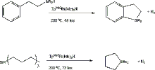 Tertiary silanes may also be dehydrogenatively coupled to aromatic rings with the use of the catalyst TpMe2Pt(Me)2H (TpMe2 = hydrido tris(3,5-dimethylpyrazolyl)borate). For example, this platinum catalyst can be used to react triethyl silane with benzene to produce phenyltriethylsilane, with the elimination of hydrogen gas. This is a terrific catalyst because it eliminates the need for a hydrogen acceptor, something which is normally required for the silation of a C-H bond. This reaction may also be done intramolecularly to produce five- or six-membered silicon-containing rings fused to a phenyl ring. In addition, tributylsilane can be converted into the corresponding cyclic organosilane via the same process. A drawback to this catalyst, however, is that it requires rather harsh reaction conditions (typically 200 °C for 24 hours for the intermolecular reaction, 48 – 72 hours for the intramolecular ones). It is also not particularly regioselective, so starting materials containing substituted benzene would result in a mixture of products.[11]