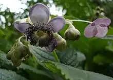 Deinanthe is a genus consisting of a few species of rare herbaceous-habit rhizomatous plants found in the mountain woodlands of East Asia, ranging from China to Japan. They are handsome clump-forming perennials good for shade, woodland and rock gardens. These attractive deciduous plants have relatively large "fishtail" leaves (cleft at the apex). Deinanthes grow at a slow rate to be bushy and shrub-like, 2 ft tall and wide. The leaves attain 3 to 4 inches in length, being deep green, roughly textured, deep veined, cordate at their bases and with serrate margins. The shoots emerge from stout, knobby rhizomes. Leaves are easily damaged in direct sun exposure. Flowering occurs in late summer to early fall. The delicate, waxy, nodding cup-shaped flowers in rich to pale purple-blue, rose or white, are borne in loose terminal clusters. Resembling gargantuan fertile hydrangea flowers, with numerous yellowish to pale blue anthers, they are occasionally accompanied by sterile flowers, as in the lacecap hydrangeas. Roots and leaves are edible.