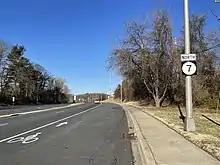 At this point, DE 7 heads north concurrent with DE 1 on a four-lane freeway. The freeway comes to a southbound exit and northbound entrance with Mall Road that serves the Christiana Mall to the east. DE 1/DE 7 continues to a modified cloverleaf interchange with I-95 (Delaware Turnpike), where DE 1 reaches its northern terminus. The I-95 interchange has flyover ramps from northbound DE 1 to northbound I-95 and from southbound I-95 to southbound DE 1 that includes a ramp to DE 7 from the southbound flyover ramp; the flyover ramps split from DE 1 south of the DE 7 interchange. The road heads through more commercial areas and comes to a partial cloverleaf interchange with DE 58, at which point the freeway segment ends; the DE 58 interchange uses the exit numbers from DE 1. In the southbound direction, a collector/distributor road serves both DE 58 (intersecting that road at-grade) and I-95. Past DE 58, DE 7 continues north at-grade as six-lane divided Stanton-Christiana Road, heading to the west of the Stanton Campus of Delaware Technical Community College before intersecting DE 4. At this point DE 4 turns north for a concurrency with DE 7, running through wooded areas with nearby development, including the Hale-Byrnes House, and passing over Amtrak's Northeast Corridor railroad line and the White Clay Creek and Mill Creek near their confluence. The road heads to the east of Delaware Park, which consists of a Thoroughbred horse racetrack, casino, and golf course. Access to Delaware Park is provided by Delaware Park Boulevard. From here, the roadway curves northeast to enter Stanton. At this point, the two routes continue into a commercial area and split into the one-way pair of Mitch Road eastbound and Main Street westbound.[3][4]