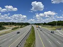The roads maintained by DelDOT include Interstate Highways, other freeways, arterial roads, collector roads, and local roads serving both urban and rural areas.[6][23] Delaware has a total of 40.61 miles (65.36 km) of freeway considered part of the Interstate Highway System.[1] Non-Interstate freeways in the state include the portion of DE 1 between Dover Air Force Base and Christiana, the section of DE 141 between south of Newport and Prices Corner, and the Puncheon Run Connector that links US 13 and DE 1 in Dover. Three toll roads exist in the state.[6] A mainline toll plaza is located along the Delaware Turnpike portion of I-95 near the Maryland border in Newark.[6][27] Tolls are also collected along the DE 1 freeway, with mainline toll plazas at Dover and Biddles Corner and ramp tolls at North Dover, South Smyrna, and Boyds Corner.[6][28] Tolls along I-95 and DE 1 may be paid with cash or an electronic toll collection system known as E-ZPass.[27][28] The US 301 toll road runs from the Maryland border near Middletown northeast to DE 1 in St. Georges. US 301 uses all-electronic tolling, where tolls are paid with E-ZPass or toll-by-plate, which uses automatic license plate recognition to take a photo of the vehicle's license plate and mail a bill to the vehicle owner. The road has a mainline toll gantry north of the Maryland border and ramp toll gantries on the southbound exits and northbound entrances at the DE 299, DE 71, and Jamison Corner Road interchanges.[29] The DRBA also collects tolls for the Delaware Memorial Bridge for motorists entering Delaware from New Jersey using cash or E-ZPass.[30] Highways and other transportation projects in Delaware are funded through both the Transportation Trust Fund and the Federal Highway Trust Fund. The Transportation Trust Fund receives revenue from tolls along I-95 and DE 1, motor fuel taxes of 23 cents per gallon on gasoline and 22 cents per gallon on special fuels, motor vehicle document and registration fees, and DMV fees. In 2013, revenues from the Transportation Trust Fund were $445.4 million while revenue from the Federal Highway Trust Fund totaled $214.5 million.[23]
