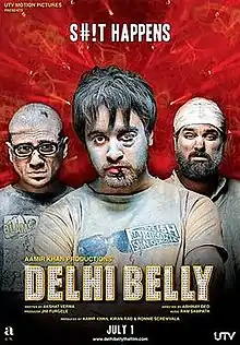 Delhi Belly is a 2011 Indian action comedy film[3][4] written by Akshat Verma and directed by Abhinay Deo. It stars Imran Khan, Kunaal Roy Kapur, Vir Das, Poorna Jagannathan and Shenaz Treasurywala. It is a Hinglish-language film, with seventy percent of the dialogue in English and thirty percent in Hindi.[5] The film is produced by Aamir Khan Productions and UTV Motion Pictures. The theatrical trailer of the film premiered with Aamir Khan's Dhobi Ghat on 21 January 2011 while the film was released on 1 July 2011, along with a Hindi dubbed version.[6][7][8] The film was given an 'A' certificate for its profanity, intense violence and sexual content.[7] The film was remade in Tamil as Settai.[9]
