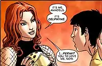 When Princess Artume conceived of a scheme to depose her mother, locate the Omphalos and use it to remake the world in the Amazons' image, Delphyne joined her. They abducted Amadeus Cho (who they believed to be Hercules's eromenos) in order to convince him to help locate the Omphalos. Delphyne warned Cho that Artume was deceiving him (claiming to have sympathy for "small animals and morons"[1]), but Cho ignored her advice initially. Eventually, however, he saw reason, and the two kissed. This was witnessed by Artume. As she explained later, she would have tolerated this but a displeasing farewell wave sealed her subordinates's fate. She attempted to murder Delphyne, but failed as a result of a lack of knowledge about Gorgon anatomy. Delphyne joined Cho, Hercules, and Athena in defeating Artume, and, in killing her, became the new Queen of the Amazons. Telling Cho that because of this she could not engage in a relationship with a man without killing him after consummation, she departed.[3]