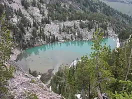 Delta Lake is located in Grand Teton National Park, in the U.S. state of Wyoming.[2] Delta Lake is situated in Glacier Gulch and is fed rock flour (glacial silt) from the Teton Glacier, which turns the water turquoise in appearance. It has been an increasingly popular hiking destination in the park, with the number of hikers increasing 164% from 2016 to 2018.[3] The easiest walk to the lake is by way of the a hike commencing from the Lupine Meadows trailhead. Following the trail to Surprise and Amphitheater Lakes and an off trail effort to the north from Surprise Lake provides access to Delta Lake.[4] The effort is considered strenuous for even getting to Surprise Lake is nearly a ten mile roundtrip with over 3,000 feet (910 m) of elevation gain.[5] Below Delta Lake lies Glacier Falls, an intermittent 300-foot (91 m) waterfall.