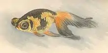 The telescope eye (Chinese: 出目金; pinyin: Chū mù jīn) is a goldfish characterised by its protruding eyes.[1][2][3] It was first developed in the early 1700s in China, where the trait was referred to as dragon eyes.