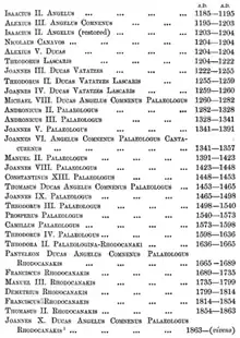 - The table lists the reigning Byzantine emperors from Isaac II Angelos (r. 1185–1195 and 1203–1204) to the last emperor, Constantine XI Palaiologos (r. 1449–1453, here numbered Constantine XIII). After Constantine, Demetrius lists Constantine's brother, Thomas Palaiologos, and then the Paleologus family of Pesaro,[10] whose descent from Thomas is not entirely historically verified.[11] Demetrius then lists members of his own Rhodocanakis family.[10] Some technically senior lines of descent are excluded: Demetrios Palaiologos, Thomas Palaiologos' older brother, is not included, nor are the undisputed verified male children of Thomas (Andreas and Manuel), though none of these figures left descendants surviving until Demetrius' time. Demetrius claimed that his family descended from Theodora, a daughter of Theodore Paleologus, through a marriage to "Eudoxia Comnena",[7] an invented figure.[12] The real descendants of Theodore, though they went extinct in the late 17th century, are excluded from Demetrius' line of succession since Theodore's "second" (only actual) wife, Mary Balls, was a Protestant (adhering to the wrong faith) and a commoner (rendering the marriage "illegal").[7]