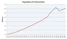 The 17 January 1939 census showed a population of 1,251,883, of which 741.5 thousand Turkmen, 232.9 thousand Russians, 107.4 thousand Uzbeks, 61.4 thousand Kazakhs, 19.5 thousand Tatars, 8,300 Iranians, 5,400 Baloch, and 75.5 thousand other nationalities.[2] The population of Turkmenistan increased from 1.5 million in the 1959 census to 4.5 million in the 1995 census.[3] The population continued growing to over 5 million in 2001–2006.[4] According to opposition media, Turkmenistan's population in 2019 was no more than 3.3 million.[5] As of July 2021, anonymous official sources informed opposition news media that the population of Turkmenistan had fallen to between 2.7 and 2.8 million.[6]
