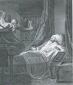 Just outside the entrance to the wood was a small hermitage known as The Temple of Death.[12] It had a thatched roof and internal enclosures formed by fake stonework panels,[15] each covered in verses reminding the reader of "the vanity, the shortness and insufficiency of human pleasures".[16] To the right-hand side of the temple entrance, hidden out of sight, was a clock that chimed every minute, which in the words of William Bowyer, was "admonishing us that Time is fleeting, and even the least portion of it to be employed in reflections on Eternity";[16][17] it was faced on the opposite side by a large white raven with a label in its mouth conveying the same message.[12] Chained to a sloping desk in the centre of the temple was a copy of Edward Young's poem Night-Thoughts and Robert Blair's The Grave, bound in black leather.[12]