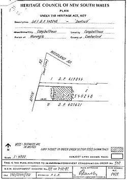 The Heritage Council of NSW approved a four-lot subdivision of the property on 7 March 1991, subject to moving the then-proposed eastern boundary of Lot 1 (containing Denfield homestead and slab hut and an original fence) further east by 3.8 metres (12 ft).[5] On 24/7/1991 the Minister for Planning signed an exemption thus not requiring Heritage Council approval for subdivision and residential use of Lot 4 which is to the east of Lot 1. This order was gazetted on 2 August 1991 in the NSW Government Gazette no. 112.[1]