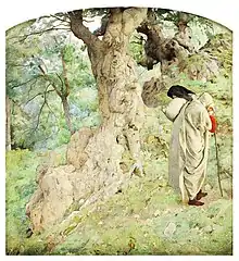 The End of the Track (aka A Pilgrim), exhibited at the autumn exhibition of the Royal West of England Academy in 1921,[86] was a more narrative work that had some similarities to the earlier Old Apple Tree. The arched top of the frame was a device often used by the Pre-Raphaelites to reference early Renaissance art, and the work is clearly an allegory on the transience of man: 'A gnarled and ancient tree, disfigured with gargoyles of anthropomorphic knots, grows seamlessly out of the rock with a new sapling beyond. An old man rests upon his staff on the path whilst a crow pecks a hole in his bundle, releasing a fine stream of grain, like sand in an hourglass.'[87] Portrait of a Young Woman, shown in 1923, may have been a portrait of his daughter Hilary, then aged 15.